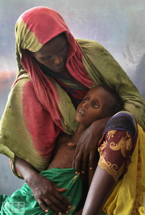 A young Somali refugee boy and his terminally ill mother, Haretha Abdi at Dadaab refugee camp, near the border of Kenya and Somalia in the horn of Africa. (Brendan Bannon/Polaris Images)